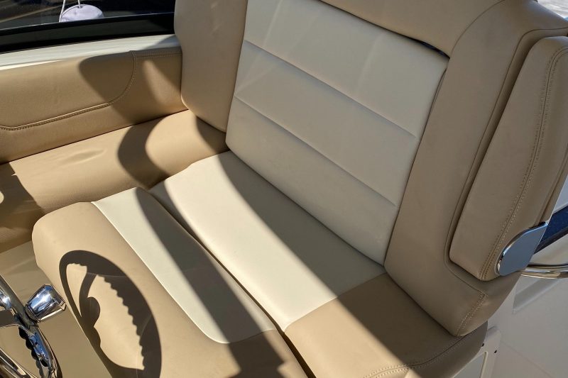 The 255 Dorado is a dual console family-friendly sportfishing model ideal for fishing, cruising, entertaining, and watersports. One of the unique innovations onboard the model is an electronic aft-facing seat that easily converts to a lounger when activated, complemented by the fold-down aft portside seat. When the seat slides out, the backrest moves into a leaning position and allows for complete comfort. Additional seating can be found with the fold-down transom bench seat, deluxe fiberglass captain’s chairs with armrests and fold-down bolsters (the portside seat can even fit two people), as well as comfortable and roomy bow seating port and starboard.